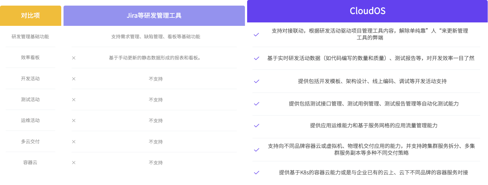针对开发,行云CloudOS通过提供一站式企业开发环境,集成在线设计、在线编码、持续集成、持续测试等能力,为企业研发效率带来大幅提升。 针对运维,通过结合容器技术、持续部署、多云管理、服务网格等能力,为运维带来高度自动化、降低运维压力。 整体上,又是实现企业DevOps落地的合适的配合平台,最终是实现企业开发和运维效率的整体提升。